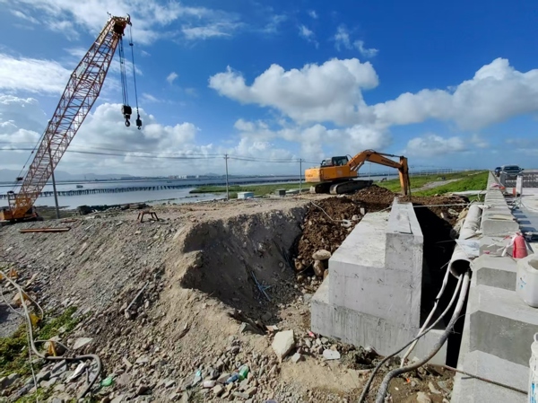 本项目栈桥全长19.7公里,是目前国内最长的同类栈桥项目。该栈桥建设实现了将海域施工转化为陆域施工,有效降低了施工期间的安全风险。由于施工区域地处瓯飞严管区域,且需跨越瓯飞一期堤坝,前期审批流程复杂繁琐。为确保栈桥顺利搭设,甬莞公司提前谋划,精准调度物资、设备及人员进场,高效克服大堤车辆通行交叉施工等难题。施工中,项目部严格把控桥台施工的质量、进度及安全环保管理,从8月9日桥台基础开挖到12日完成混凝土浇筑,仅用4天就高质量完成2个桥台施工,为栈桥后续建设筑牢了关键根基。