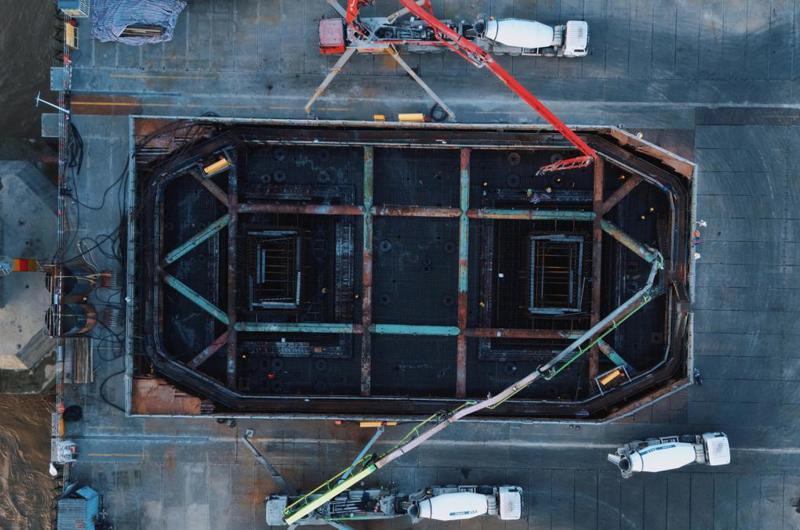 此次完成浇筑的6号主墩承台,与此前已完工的5号主墩承台共同构成大桥的“超级底座”,将为后续桥体与主塔提供稳固支撑。为确保这一万吨级八边形巨型结构完美成型,施工团队全程开启“精细化作战”模式,安排多辆混凝土搅拌车24小时循环运输,保障原料供应不间断,同时在承台内部预先埋设冷却水管,实时监测并调控混凝土温度,有效规避混凝土开裂风险,全力保障工程品质。