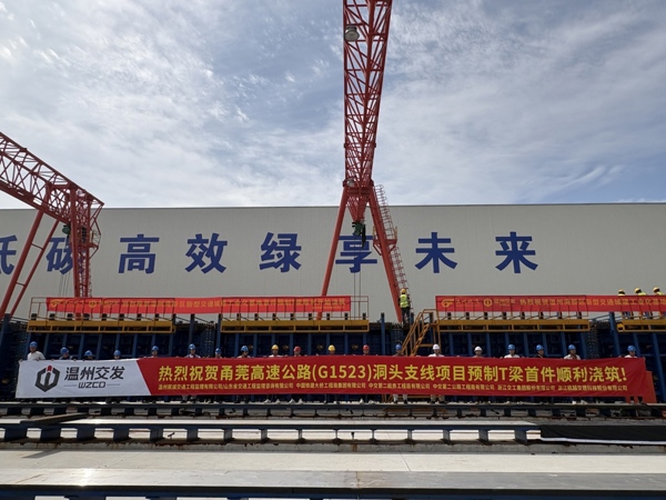 4月27日,甬莞高速公路(G1523)洞头支线50米预制T梁首件在温州湾新区新型交通城建工业化基地顺利浇筑,为项目后续批量生产与高效推进奠定了坚实的技术基础。