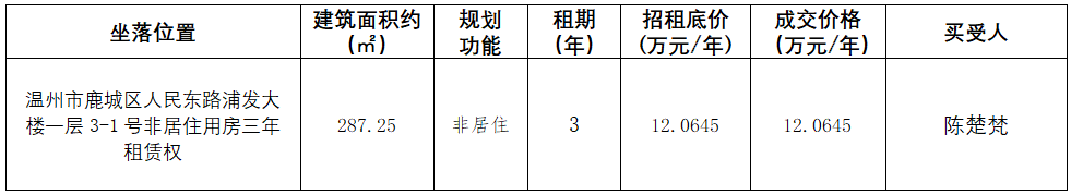 温州房地产开发股份有限公司就温州市鹿城区人民东路浦发大楼一层3-1号非居住用房三年租赁权于2025年9月22日至9月26日进行公开招租,经评估机构评估、委托产权交易中心竞价及公开竞价并按相关程序审批,已完成公开竞价,现将竞价结果公示如下: