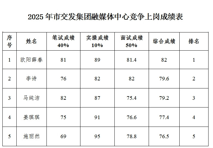 经笔试、实操、面试等环节,现将此次集团融媒体中心责任编辑岗位各项成绩公告如下。