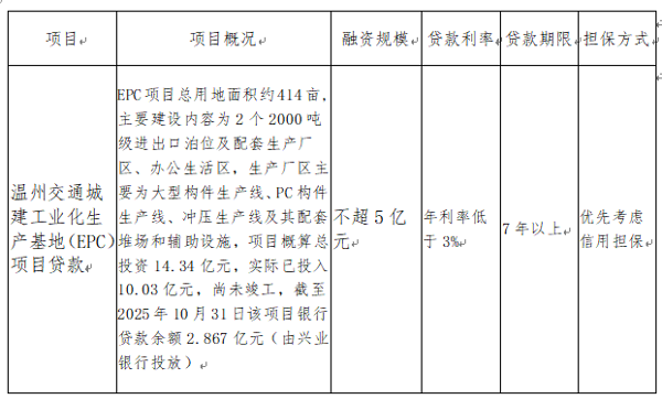 根据温州交通城建工业化生产基地(EPC)项目建设需要,浙江瓯越交建科技股份有限公司拟向银行类金融机构申请项目融资贷款。项目简介如下: