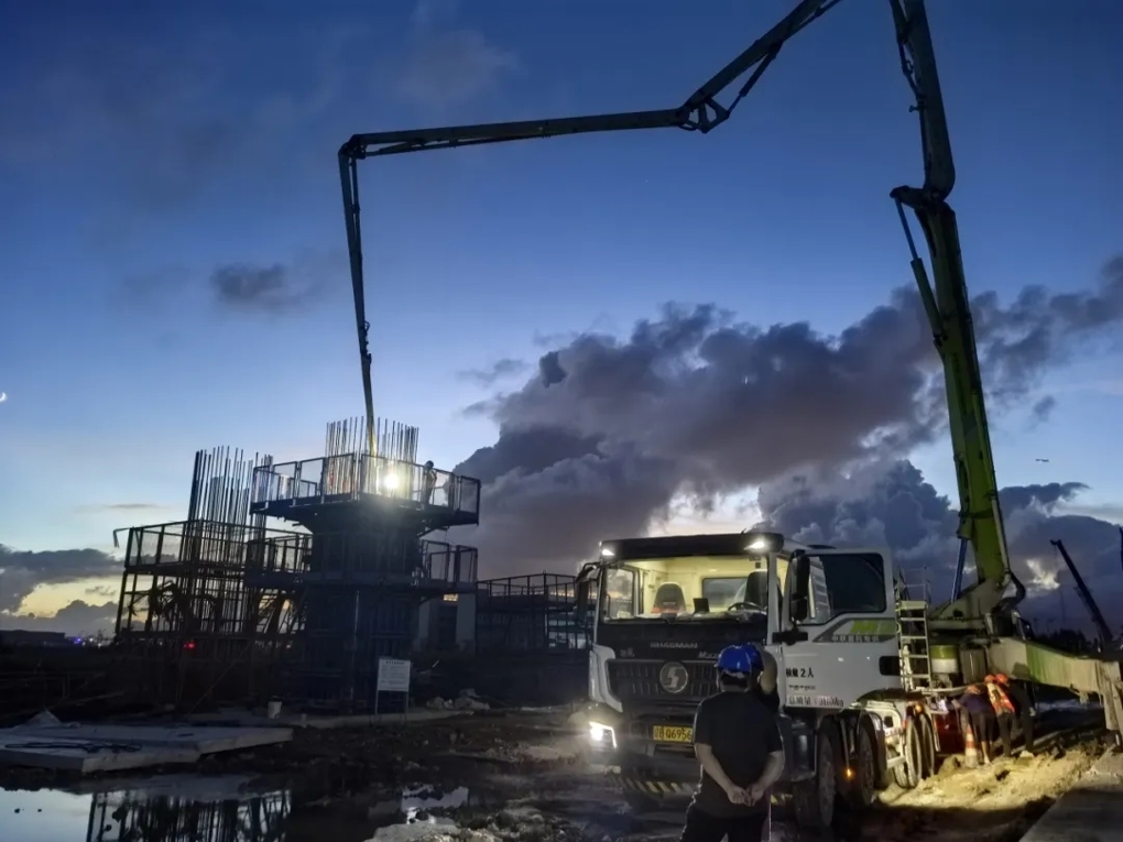 本次浇筑的墩柱尺寸为2米×2米×高13.5米,采用C40机制砂海工混凝土。为确保首个墩柱顺利浇筑,甬莞公司以“品质耐久、安全可控”为目标,聚焦保护层精度与外观质量实施双控。在保护层控制方面,通过设计、监理、施工三方协同,优化钢筋加工与安装工艺,全面提升工前合格率;在外观质量方面,依托试验墩优化配合比,并应用透水模板布工艺,增强混凝土表观质量与耐久性。施工过程中,整合汽车泵与罐车协同作业,实现一次性连续浇筑,有力保障结构整体性与内在品质。
