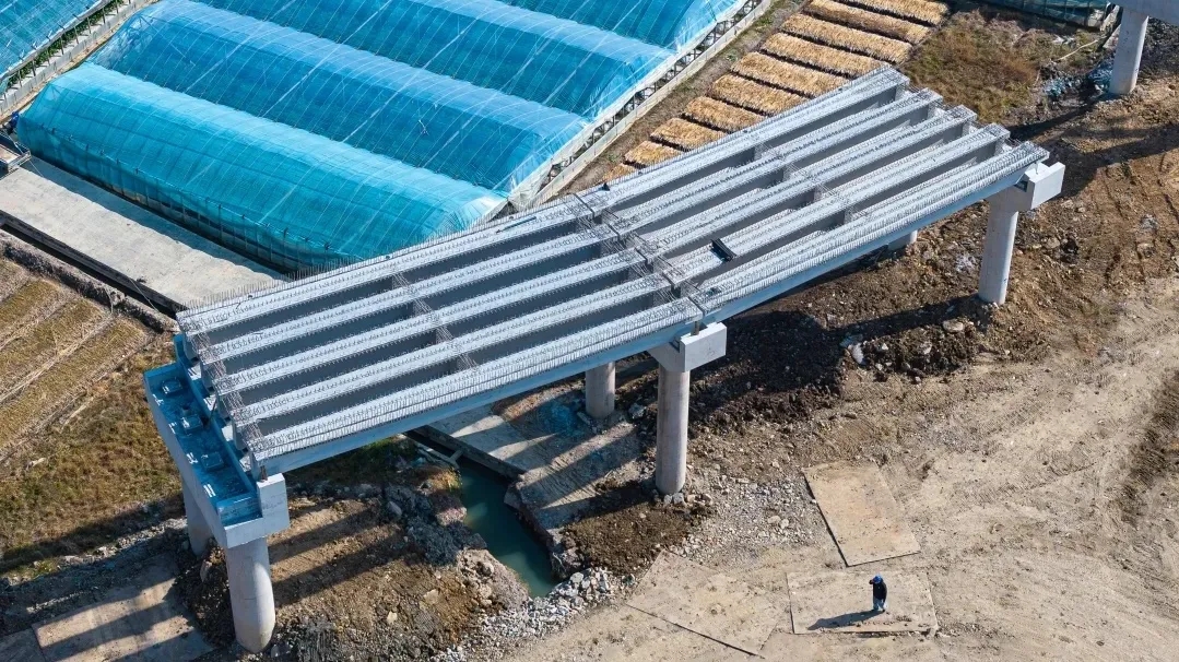 11月25日,在苍泰高速1标马站西互通E匝道施工现场,两台大型起重机协同作业,顺利完成首片叠合预制T梁的架设,标志着项目苍南段桥梁上部结构施工取得重要进展,为后续桥面系施工奠定坚实基础。